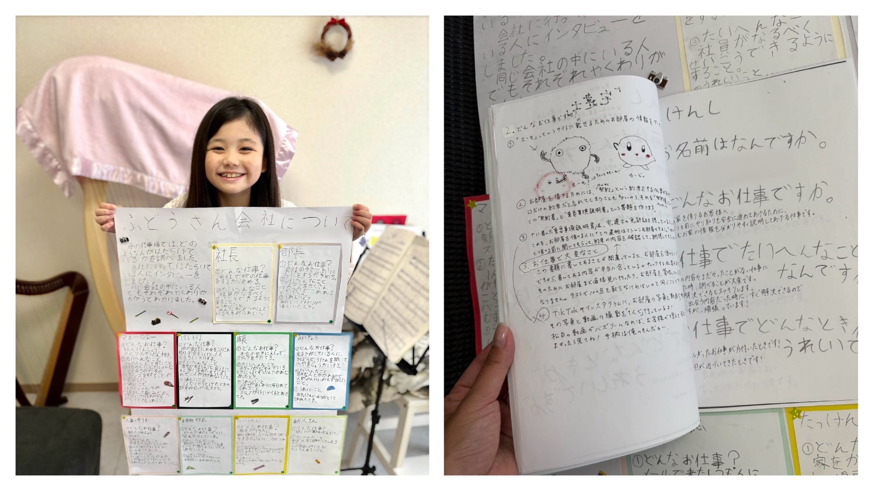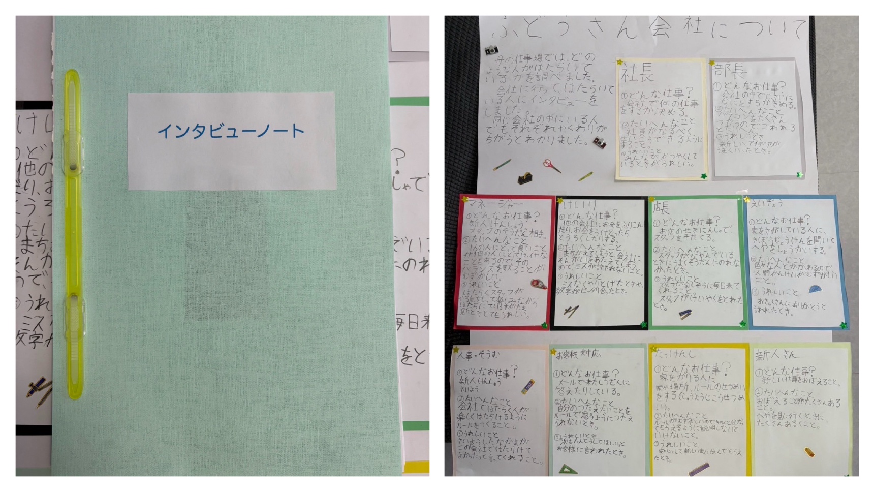 インタビューノートを手に会社にやってきて、社長👨💼・部長👔・マネージャー🧑🤝🧑・営業🙋♂️・経理🧾・人事📝・宅建士📑など、普段は家でなかなか聞けない「大人の仕事」を一人ひとりに質問していきました。